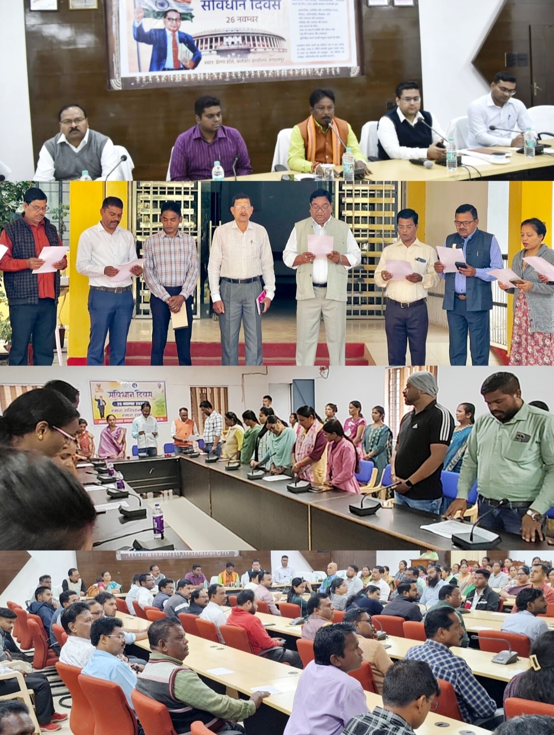जगदलपुर (डेस्क) – संविधान दिवस के अवसर पर जगदलपुर में जिला प्रशासन और संभागायुक्त कार्यालय द्वारा अलग-अलग कार्यक्रमों का आयोजन किया गया, जहाँ बस्तर सांसद महेश कश्यप और कमिश्नर डोमन सिंह ने अधिकारियों-कर्मचारियों के साथ मिलकर भारतीय संविधान की प्रस्तावना का सामूहिक वाचन किया और संवैधानिक मूल्यों को सर्वोपरि रखने का संकल्प लिया.