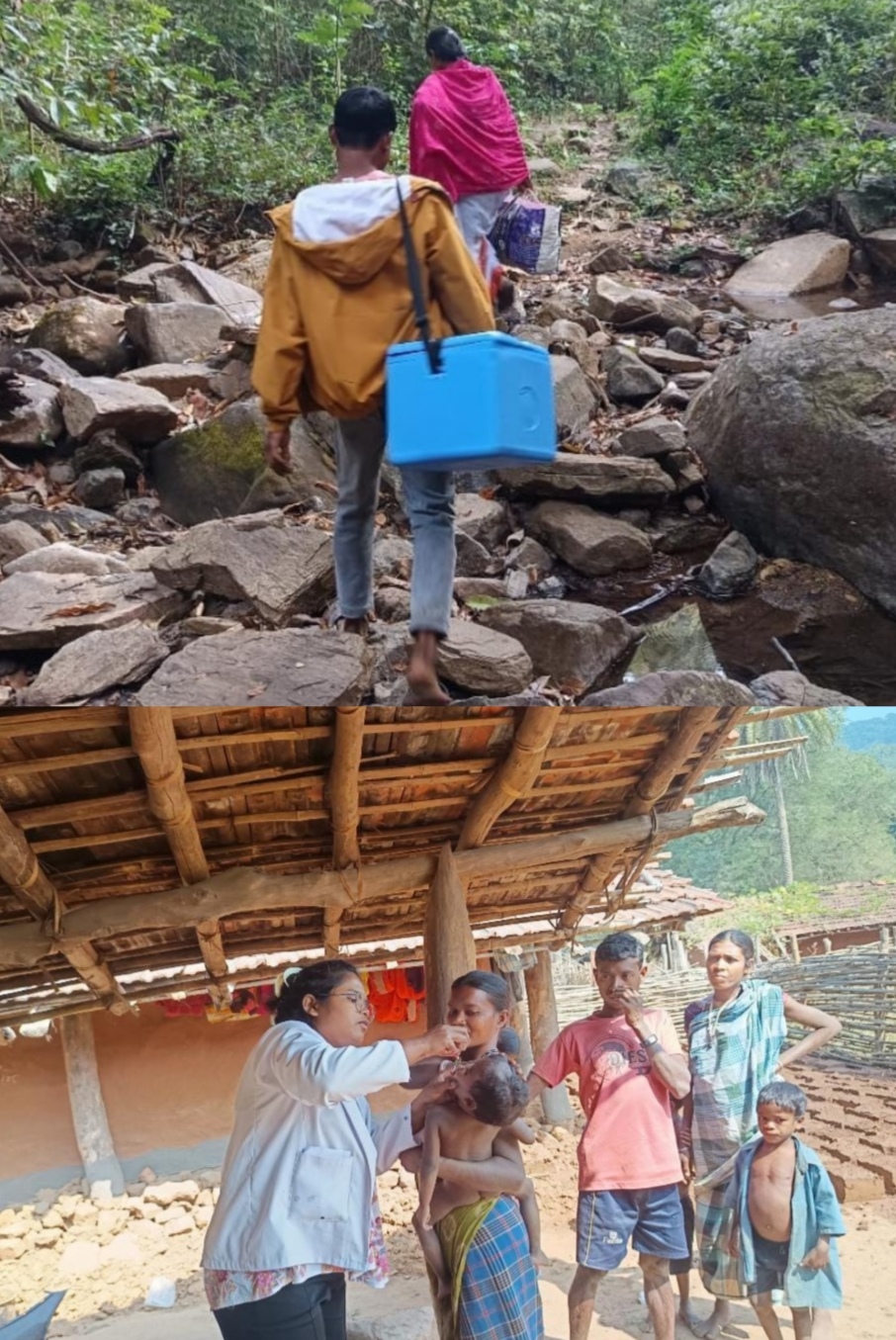 सुकमा (नवीन कश्यप) – सुदूर वनांचल के पहाड़ों पर जब सुबह की पहली किरण पड़ी, तो कुछ कदमों की आहट ने सन्नाटे को तोड़ दिया. ये कदम किसी पर्यटक के नहीं, बल्कि उन ‘स्वास्थ्य वीरों’ के थे जो अपने कंधों पर वैक्सीन का बॉक्स नहीं, बल्कि सुकमा के भविष्य की सुरक्षा का बोझ लेकर चल रहे थे. यह कहानी है सुकमा जिले के पोरों कोंडा सांवली गांव की, जहां पहुंचने के लिए न सड़कें हैं, न पुल. रास्ता है तो बस ऊंचे पहाड़, कटीले जंगल और पत्थरों भरी पगडंडियां. लेकिन प्रशासन के अटूट संकल्प और स्वास्थ्य कर्मियों के जज़्बे ने साबित कर दिया कि दुर्गम रास्ते भी मंज़िल के आगे घुटने टेक देते हैं.