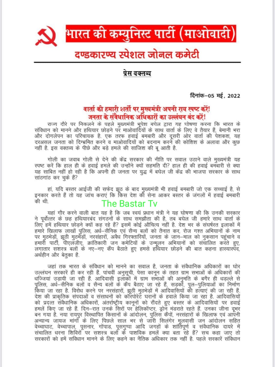 सुनील कश्यप, बस्तर। नक्सलियों के दंडकारण्य स्पेशल जोनल कमेटी के प्रवक्ता विकल्प ने एक प्रेस नोट जारी किया है। प्रेस नोट जारी कर प्रेस नोट जारी कर प्रवक्ता विकल्प ने मुख्यमंत्री भूपेश बघेल द्वारा किए गए वार्ता की पेशकश को सशर्त स्वीकार किया है।