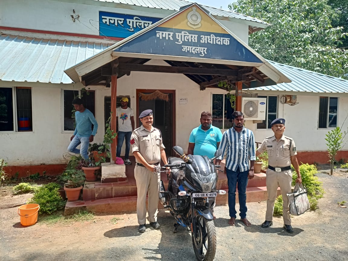 एएसपी हेमसागर ने बताया कि शहर के संजय बाजार में स्थित एक दुकान का व्यापारी अशोक दुल्हानी दो दिन पहले देर शाम अपनी दुकान बंद कर के वापस स्कूटी में सवार होकर अपने घर कुम्हारपारा की तरफ जा रहा था। दुकान बंद करने बीच अशोक ने अपनी स्कूटी के डिक्की में दुकान का 2 लाख रुपये नगद, एक चांदी का सिक्का और अन्य सामान रख लिया था। इसी दौरान अशोक महारानी अस्पताल के सामने एक दुकान में गुपचुप खाने के लिए रुक गया। इसी दौरान अज्ञात चोरों ने मास्टर चाबी का इस्तेमाल करते हुए अशोक के स्कूटी का डिक्की खोलकर उसमें रखा 2 लाख रुपये नगद, एक चांदी का सिक्का और अन्य सामान पर हाथ साफ कर दिया। इसके बाद अज्ञात चोर मौके से फरार हो गए। घटना से अनजान अशोक गुपचुप खाने के बाद अपने घर पहुंच गया। इसके बाद अशोक ने स्कूटी में रखे रुपये और अन्य सामान निकालने के लिए जैसे ही डिक्की खोला तो उसके होश उड़ गए, उसने देखा कि डिक्की से सारे रुपये और अन्य सामान गायब है। देर ना करते हुए अशोक ने तत्काल कोतवाली थाना पहुंचकर इस मामले को लेकर रिपोर्ट दर्ज कराई। रिपोर्ट दर्ज होने के बाद बस्तर पुलिस के वरिष्ठ अधिकारियों के दिशा निर्देश पर कोतवाली टीआई एमन साहू के नेतृत्व में पुलिस की एक टीम का गठन किया गया। इसके बाद पुलिस ने मौके पर पहुंचकर मिशन सिक्योर सिटी एवं सिटी सर्विलेंस सिस्टम के अंतर्गत शहर में लगाये गए सीसीटीवी कैमरों के फुटेज निकाली गई। फुटेज के आधार पर फिर पुलिस ने दो संदिग्ध व्यक्तियों की पहचान कर ली। इसके बाद पुलिस तुरंत ही उक्त संदिग्ध व्यक्तियों की तलाश में जुट गई। इसी दौरान पुलिस को दोनों संदिग्ध व्यक्तियों को संजय बाजार में फिर देखें होने की सूचना मिली। सूचना मिलते ही पुलिस ने संजय बाजार में दो संदिग्ध युवकों को घेराबंदी करते हुए पकड़ लिया। इसके बाद पुलिस ने दोनों से कड़ी पूछताछ की। जिसमें दोनों आरोपियों ए. अनिल (30) निवासी ओड़िसा और करन नेताम (24) निवासी महासमुंद ने अपना जुर्म कबूल कर लिया। आरोपियों ने पुलिस को बताया कि वह दोनों ने पहले अशोक दुल्हानी का पीछा किया। इसके बाद जब अशोक गुपचुप खाने के लिए दुकान के अंदर चला गया तो आरोपियों ने अपने पास रखे एक मास्टर चाबी का इस्तेमाल करते हुए स्कूटी का डिक्की खोलकर उसमें रखा 2 लाख रुपये, चांदी का सिक्का और अन्य सामान पार कर दिया। फिलहाल पुलिस ने आरोपियों के कब्जे से उठाईगिरी के 2 लाख रुपये, एक चांदी का सिक्का (कीमती 15 हजार रुपये) और अन्य सामान जब्त कर लिया है। इसके साथ ही पुलिस ने आरोपियों के कब्जे से एक बाइक भी बरामद की है। जिसमें आरोपियों ने फर्जी नम्बर चस्पा कर रखा था। पुलिस ने आवश्यक कार्रवाई के बाद दोनों आरोपियों को न्यायिक हिरासत में भेज दिया है।
