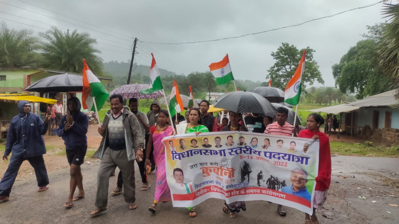 दंतेवाड़ा (कवि सिन्हा)। विश्व आदिवासी दिवस के मौके पर जिला कांग्रेस कमेटी द्वारा आजादी के 75 वर्ष पूण होने पर हरिक जयंती पदयात्रा का आयोजन किया गया। इस पदयात्रा में शामिल होने जिला पंचायत अध्यक्ष तुलिका कर्मा आज कटेकल्याण पहुँची। कार्यक्रम की शुरुआत करते तुलिका ने सर्वप्रथम माँ दंतेश्वरी मंदिर में मत्था टेका ततपश्चात वीर शहीद बिरसा मुंडा, रानी दुर्गावती, गुंडाधुर के चित्र पर माल्यार्पण कर पदयात्रा प्रारम्भ की गई। पदयात्रा में महंगाई को लेकर मोदी सरकार के खिलाफ जमकर नारेबाजी की गई। तुलिका ने बताया कि आजादी के इस 75 वें वर्ष पर कांग्रेस द्वारा किये गए कार्यो को जन-जन पहुचाया जा रहा है। तुलिका ने कहा कि विश्व आदिवासी दिवस के पावन दिवस पर इस पदयात्रा की शुरुआत की गई है, जिससे लोगों में पदयात्रा का उत्साह दोगुना हो गया है। 75 किलोमीटर की इस पदयात्रा में हर कोई बढ़चढ़ कर हिस्सा ले रहा है।