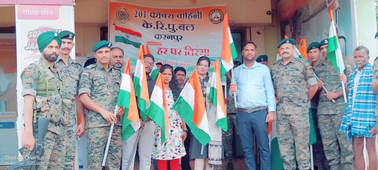 सुनील कश्यप, जगदलपुर। देश के 75 वें स्वतंत्रता दिवस के उपलक्ष में आजादी का अमृत महोत्सव पर बस्तर में नक्सली मोर्चे पर तैनात CRPF 201 कोबरा वाहिनी के कमांडेंट सौमित्र रॉय के मार्गदर्शन में हर्षोल्लास के साथ हर घर तिरंगा कार्यक्रम का आयोजन किया गया। भारत सरकार के इस अभियान को लेकर 201 कोबरा वाहिनी के जवान मुख्यालय के साथ-साथ आसपास के गांवों के घर-घर पहुंच रहे हैं। इसके साथ ही स्कूल, अस्पताल, बैंक आदि स्थानों में पहुंचकर भी तिरंगा अभियान को सफल बनाने के लिए जागरुकता कार्यक्रम चला रहे हैं। ताकि बस्तरवासियों में देश के प्रति प्रेम की भावना को बढ़ाई जा सके और तिरंगे के सम्मान के बारे में ग्रामिणों को अवगत कराया जा सके। भारत सरकार के इस कार्यक्रम को जन-जन तक पहुंचाने के लिए 201 कोबरा वाहिनी द्वारा गांव-गांव में कार्यक्रम का आयोजन किया गया। और इस कार्यक्रम के माध्यम से भारत सरकार की इस मुहिम को लेकर 13 से 15 अगस्त तक अपने घरों में तिरंगा फहराकर इस महोत्सव में अपनी भागीदारी निभाने के लिए ग्रामीणों को प्रेरित किया गया।