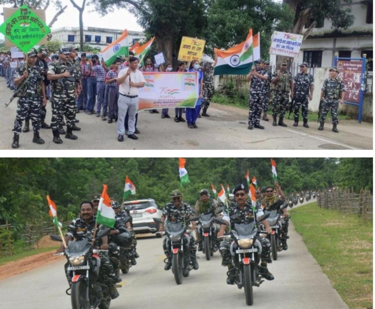 सुकमा जिले के नक्सल प्रभावित क्षेत्रों में तैनात CRPF 74, 02, 223 वीं बटालियन के अधिकारियों, जवानों ने केंद्रीय विद्यालय सुकमा, नवोदय विद्यालय सुकमा के लगभग 300 से अधिक स्कूली बच्चों, उनके अभिभावकों व शिक्षकों ने बड़े ही हर्षोल्लास के साथ आजादी का अमृत महोत्सव मनाया। इसके अलावा सभी ने आसपास के इलाकों में पैदल मार्च निकालकर आम नागरिकों को जागरूक किया। और हर घर तिरंगा अभियान को जन-जन तक पहुँचाकर जागरूक किया गया। CRPF के अधिकारियों ने बताया कि पहले इस क्षेत्र के ग्रामीण जवानों से डरते थे, लेकिन पिछले एक-दो सालों से पुलिस के प्रति यहां के ग्रामीणों का विश्वास बढ़ा है। इस राष्ट्रीय पर्व को मनाने के लिए ग्रामीणों में काफी उत्साह नजर आता है, वही आजादी के अमृत महोत्सव पर हर घर तिरंगा घर-घर तिरंगा अभियान को लेकर भी ग्रामीणों में काफी उत्साह देखने को मिल रहा है, बकायदा गांव के ग्रामीण और स्कूली बच्चे जवानों के साथ हाथों में तिरंगा लेकर रैली निकाल रहे हैं, साथ ही घरों में तिरंगा झंडा लगा रहे हैं। इस अवसर पर अनामी शरण द्वितीय कमान अधिकारी, जितेंद्र कुमार प्राचार्य केंद्रीय विद्यालय, राकेश ओझा प्राचार्य नवोदय विद्यालय, रति कांत बेहरा कमांडेंट, देवेंद्र नाथ यादव कमांडेंट, रघुवंश प्रसाद कमांडेंट, पवन कुमार द्वितीय कमान अधिकारी, अनामी शरण द्वितीय कमान अधिकारी, सजीव कुमार उप कमांडेंट, भास्कर भट्टाचार्य उप कमांडेंट व अन्य जवान, स्कूली बच्चे व ग्रामीण मौजूद थे।
