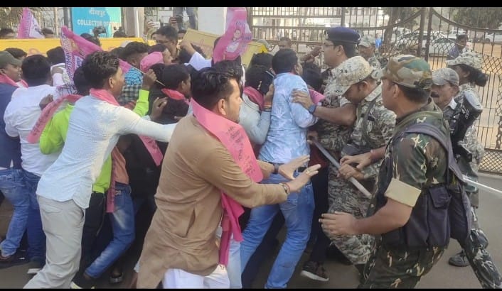 पांच सूत्रीय मांग को लेकर कलेक्ट्रेट घेराव करने निकले जनता कांग्रेस के कार्यकर्ताओं ने बेरिकेडिंग के नजदीक गांधीवादी तरीके से प्रदर्शन किया, लेकिन थोड़ी देर बाद ही नारेबाजी करते बेरिकेड्स पर चढ़ाई कर दी और सुरक्षा घेरा तोड़ अंदर दाखिल हो गए, इस दौरान कार्यकर्ताओ की पुलिस के साथ जमकर झूमा झटकी हुई।