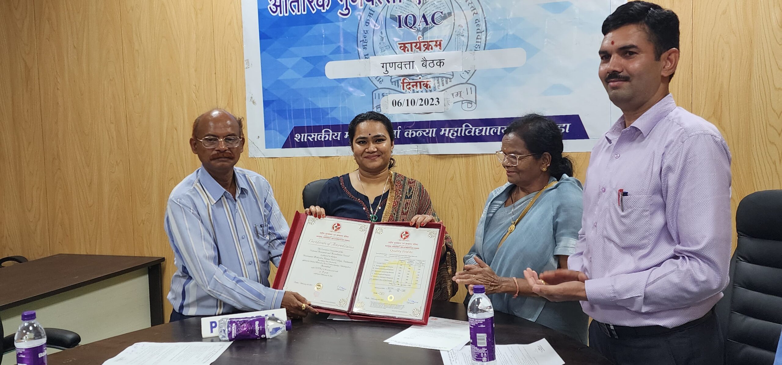 दंतेवाड़ा (कवि सिन्हा). शासकीय महेंद्र कर्मा कन्या महाविद्यालय के आंतरिक गुणवत्ता आश्वासन प्रकोष्ठ (IQAC) की बैठक आयोजित की गई. महाविद्यालय के आंतरिक गुणवत्ता आश्वासन प्रकोष्ठ के माध्यम से महाविद्यालय में विभिन्न प्रकार के गुणवत्ता उन्नयन संबंधी कार्य किए जाते हैं, जिनका मूल्यांकन नेक के द्वारा किया जाता है. महाविद्यालय में गुणवत्ता उन्नयन संबंधी किए गए कार्यों के परिणाम स्वरुप ही महाविद्यालय ने नैक मूल्यांकन के प्रथम चरण में 2.39 सीजीपीए के साथ बी ग्रेड प्राप्त की जिसके प्रमाण पत्र का विमोचन जिला पंचायत अध्यक्ष तुलिका कर्मा द्वारा किया गया. उल्लेखनीय है कि तुलिका कर्मा महाविद्यालय की जन भागीदारी समिति की अध्यक्ष भी हैं जिनका नैक मूल्यांकन हेतु विभिन्न प्रकार के शुल्क जमा करने, महाविद्यालय में दो कंप्यूटर उपलब्ध करवाने तथा महाविद्यालय के पुस्तकालय के साथ अन्य विकासात्मक कार्य हेतु अपना सहयोग प्रदान किया है. पुस्तकालय में ईलाइब्रेरी की शुरुआत, ऑनलाइन उपलब्ध ई बुक, पाठ्य सामग्री आदि तक छात्राओं की पहुंच बनाने के लिए QR-Code का निर्माण किया गया. इसके साथ ही पुस्तकालय को एनआईसी नई दिल्ली, भारत सरकार द्वारा विकसित ई-ग्रन्थालय (eG4.0) सॉफ्टवेयर के माध्यम से पूरी तरह से ऑटोमेट किया गया. तुलिका कर्मा एवं अन्य सदस्यो के द्वारा महाविद्यालय में पुस्तकालय के विस्तार, वाचनालय निर्माण, आईसीटी सुविधा के उपयोग हेतु स्मार्ट क्लासरूम के निर्माण, रोजगार मार्गदर्शन समिति के माध्यम से करवाई गई. प्रतियोगी परीक्षाओं की तैयारी एवं छात्राओं के चयन की प्रशंसा करते हुए नेक की उपलब्धि पर प्राचार्य डॉ. आरके हिरकने तथा महाविद्यालय परिवार को बधाई दी गई. बैठक में पार्षद श्रीमती जी. रेणु राव, शासकीय दंतेश्वरी स्नातकोत्तर महाविद्यालय से डॉ. के. एम. प्रसाद, डॉ. दिनेश लहरी, दुष्यंत तारम सहित महाविद्यालय के सहायक प्राध्यापक, अतिथि व्याख्याता, कार्यालयीन स्टाफ एवं अन्य सदस्य उपस्थित रहे.