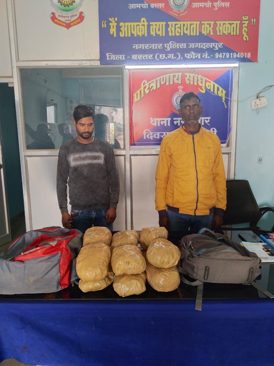 सीएसपी विकास कुमार ने बताया कि बीते कल गुरुवार की रात पुलिस को मुखबिर से सूचना मिली थी कि दो युवक एक यात्री बस में संदिग्ध सामान ओड़िसा से लेकर जगदलपुर की तरफ जा रहे है. सूचना मिलते ही बस्तर पुलिस के वरिष्ठ अधिकारियों के दिशा निर्देश पर नगरनार टीआई के नेतृत्व में पुलिस की एक टीम को तुरंत ही धनपुंजी में स्थित फारेस्ट नाका के लिए रवाना किया गया. मौके पर पहुंचते ही पुलिस ने नाकेबंदी करते हुए वहां से गुजरने वाले वाहनों की तलाशी लेना शुरू कर दिया. इसी दौरान पुलिस ने ओड़िसा की ओर से आ रहे एक यात्री बस को चेकिंग के लिए रोक लिया. इसके बाद पुलिस ने बस में सवार सभी यात्रियों की तलाशी लेते हुए उनसे पूछताछ शुरू की. तलाशी के बीच ही पुलिस ने बस में सवार दो युवकों के बैग से लगभग 12 किलो 755 ग्राम गांजा बरामद किया. जिसकी कीमत 1 लाख 27 हजार से ज्यादा आंकी गई है. गांजा बरामद होते ही पुलिस ने दोनों युवकों को पकड़ लिया. इसके बाद पुलिस ने पकड़े गए युवकों मोहम्मद निसार (37) और शाहिद शेख (28) दोनों निवासी झारखंड से कड़ी पूछताछ शुरू की. कड़ी पूछताछ में दोनों आरोपियों ने अपना जुर्म कबूल करते हुए पुलिस को बताया कि वह दोनों यह गांजा ओड़िसा से खरीदकर झारखंड में खपाने की तैयारी में थे. जुर्म कबूल करते ही पुलिस ने दोनों आरोपियों को गिरफ्तार कर लिया. फिलहाल पुलिस ने एनडीपीएस की धारा के तहत मामला दर्ज करते हुए दोनों आरोपियों को जेल भेज दिया है.
