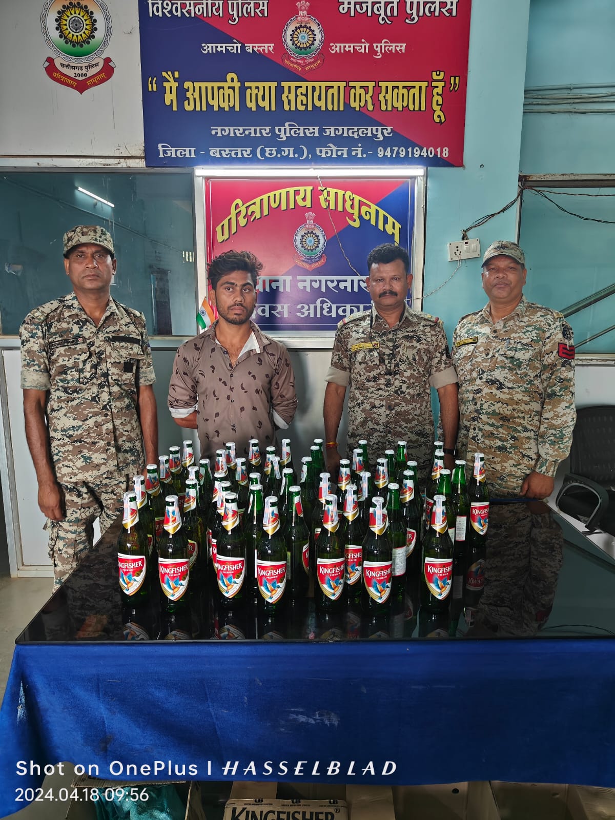एएसपी महेश्वर नाग ने बताया कि पुलिस को मुखबिर से सूचना मिली कि एक युवक अपने बाइक में अवैध रूप से अंग्रेजी शराब ओड़िसा की तरफ लेकर जगदलपुर की ओर जा रहा है. सूचना मिलते ही बस्तर पुलिस के वरिष्ठ अधिकारियों के दिशा निर्देश पर नगरनार टीआई टामेश्वर चौहान के नेतृत्व में पुलिस की एक टीम तैयार की गई. उक्त पुलिस की टीम को तत्काल ही मारकेल चौक के लिए रवाना किया गया. इसके बाद पुलिस की टीम ने ओड़िसा की तरफ से आ रहे एक बाइक सवार युवक को घेराबंदी करने के बाद पकड़ लिया. पकड़ने के बाद पुलिस ने युवक से पूछताछ करते हुए उसके पास रखे कार्टून की तलाशी ली. तलाशी में पुलिस को कार्टून से 48 नग किंगफिशर बियर की बोतलें मिली. जिसकी कीमत 5 हजार रुपये से ज्यादा बताई गई है. शराब की बोतलें मिलते ही पुलिस ने बाइक सवार युवक को पकड़ लिया. इसके बाद पुलिस ने पकड़े गए युवक से कड़ाई से पूछताछ शुरू की. कड़ी पूछताछ में आरोपी संतोष नायक (23) निवासी ग्राम बारदा ने अपना जुर्म कबूल कर लिया. आरोपी ने पुलिस को बताया कि वह यह अवैध अंग्रेजी शराब ओड़िसा से खरीदकर बस्तर में अवैध रूप से बेचने की फिराक में था. लेकिन इससे पहले ही पुलिस ने आरोपी को धर दबोचा. जुर्म कबूल करते ही पुलिस ने आरोपी को गिरफ्तार कर लिया. फिलहाल पुलिस ने आबकारी एक्ट की धारा 34 (2) के तहत मामला दर्ज करते हुए आरोपी को न्यायिक हिरासत में भेज दिया है.