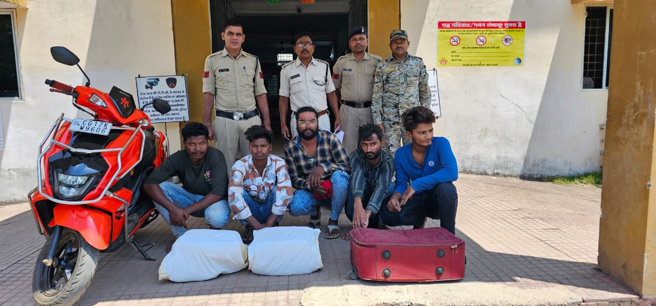 एएसपी महेश्वर नाग ने बताया कि पुलिस को मुखबिर से सूचना मिली थी कि राजस्थान निवासी दो युवक एनएच 30 में स्थित नया पुलिया के पास खड़े होकर गांजा सप्लायर का इंतजार कर रहे है. सूचना मिलते ही बस्तर पुलिस के वरिष्ठ अधिकारियों के दिशा निर्देश पर कोतवाली टीआई के नेतृत्व में पुलिस की एक टीम को तत्काल ही मौके पर के लिए रवाना किया गया. मौके पर पहुंचते ही पुलिस की टीम ने दो संदिग्ध युवकों को पहचान लिया. पुलिस ने संदिग्ध युवकों से पूछताछ की. पूछताछ में युवकों ने गांजे की डिलीवरी लेने की बात कबूल कर ली. इसके बाद पुलिस की टीम भी गांजे के सप्लायर के आने का इंतजार करने लगी. कुछ देर इंतजार करने के बाद पुलिस ने देखा कि तीन युवक एक स्कूटी सीजी 17 केडब्लू 9606 में सवार होकर वहां पहुंचे. बाइक सवार युवकों ने दो बोरे पकड़ रखे थे. इसके बाद स्कूटी सवार युवकों ने जैसे ही दोनों बोरों को वहां इंतजार कर रहे युवकों को दिया, वैसे ही पुलिस की टीम ने घेराबंदी करते हुए सभी युवकों को धर दबोचा. तलाशी लेने पर पुलिस ने युवकों के पास रखे दोनों बोरो से लगभग 20 किलो से अधिक मात्रा में गांजा बरामद किया. जिसकी कीमत 1 लाख रुपये से ज्यादा आंकी गई है. पकड़ने के बाद पुलिस ने सभी युवकों से कड़ाई से पूछताछ शुरू की. कड़ी पूछताछ में राजस्थान निवासी किशनलाल सालेवि और शिवलाल गाडरी ने पुलिस को बताया कि जगदलपुर निवासी घण्टेश्वर माहरा, राजेश बघेल और मोनू यादव से उनकी बात हुई थी. यह तीनों युवक उन्हें 20 किलो गांजा ओड़िसा से लाकर देने आए थे. जिसके लिए उन्होंने फ़ोन पे के जरिये कुछ रुपये भी दिए थे. और इसके पहले भी किशनलाल और शिवलाल ने इन युवकों से गांजा खरीद था. वहीं पुलिस की कड़ी पूछताछ में बाइक सवार तीनों युवकों ने भी अपना जुर्म कबूल कर लिया. जुर्म कबूल करते ही पुलिस ने सभी आरोपियों किशनलाल सालेवि (26), शिवलाल गाडरी (19), घण्टेश्वर माहरा (27) निवासी सनसिटी अटल आवास, राजेश बघेल (20) निवासी सनसिटी अटल आवास और मोनू यादव (26) निवासी सोमाबाड़ा शांतिनगर वार्ड को गिरफ्तार कर लिया है. फिलहाल पुलिस ने एनडीपीएस की धारा 20 (बी) के तहत मामला दर्ज करते हुए सभी आरोपियों को न्यायिक हिरासत में भेज दिया है.