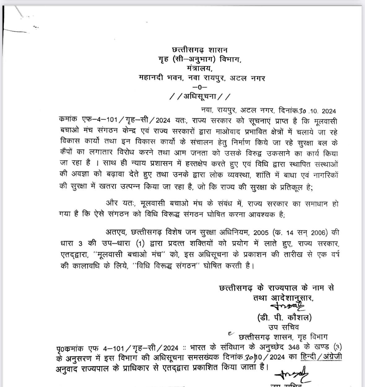 जगदलपुर. बस्तर संभाग के विभिन्न इलाकों में सुरक्षाबल के कैम्पों का विरोध और लोगों को उकसाने के आरोप में प्रदेश की विष्णु देव साय सरकार ने मूलवासी बचाओ मंच संगठन को राज्य में प्रतिबंधित कर दिया है.
