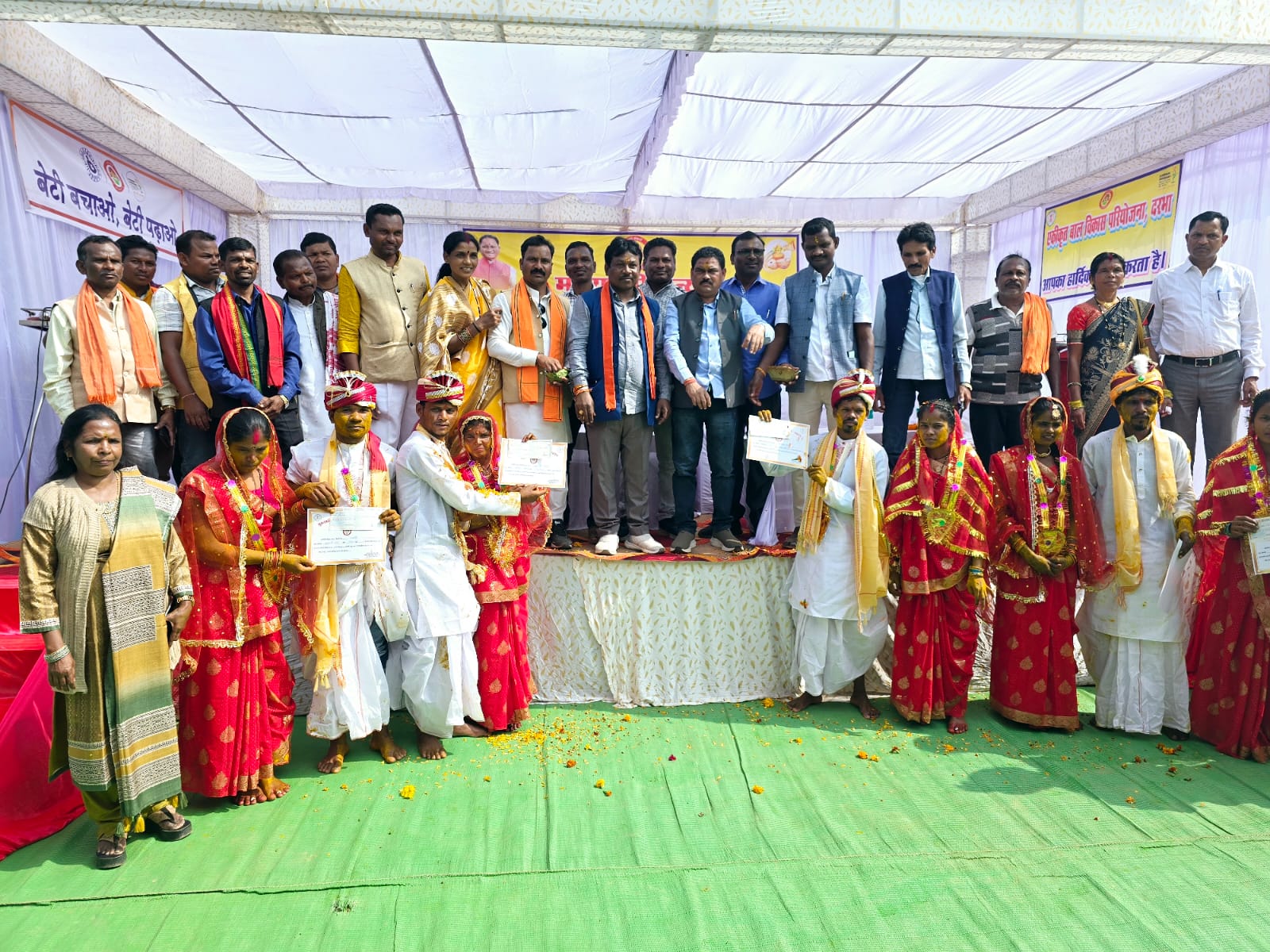 जगदलपुर (सोमारू नाग)– बस्तर जिले के दरभा विकास खंड में मुख्यमंत्री सामूहिक कन्या विवाह का आयोजन बीते कल मंगलवार को ग्राम पंचायत चिड़पाल में किया गया. जहां दरभा ब्लॉक के बाल विकास विभाग दरभा अंतर्गत आने वाले 30 जोड़े नव दंपतियों का सामूहिक विवाह सम्पन्न कराया गया. और मुख्यमंत्री सामूहिक कन्या विवाह के आयोजन में प्रत्येक नव दंपति जोड़े को 33 हजार रुपए का चेक कन्यादान के रूप में प्रदान किया गया.