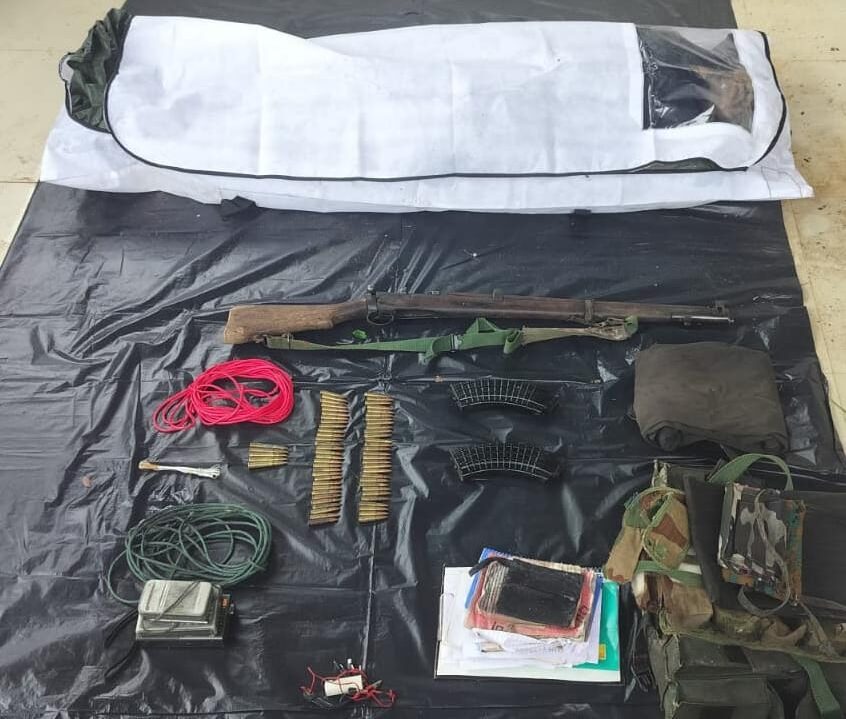 एक नग .303 रायफल व 05 नग जीवित राउंड,एके-47 का मैग्जीन और 59 नग जीवित राउंड,माओवादी वर्दी – 01 जोड़ी,कोडेक्स वायर, डेटोनेटर, सेफ्टी फ्यूज, नक्सली साहित्य,पिट्ठू बैग, रेडियो और दैनिक उपयोग की सामग्री.