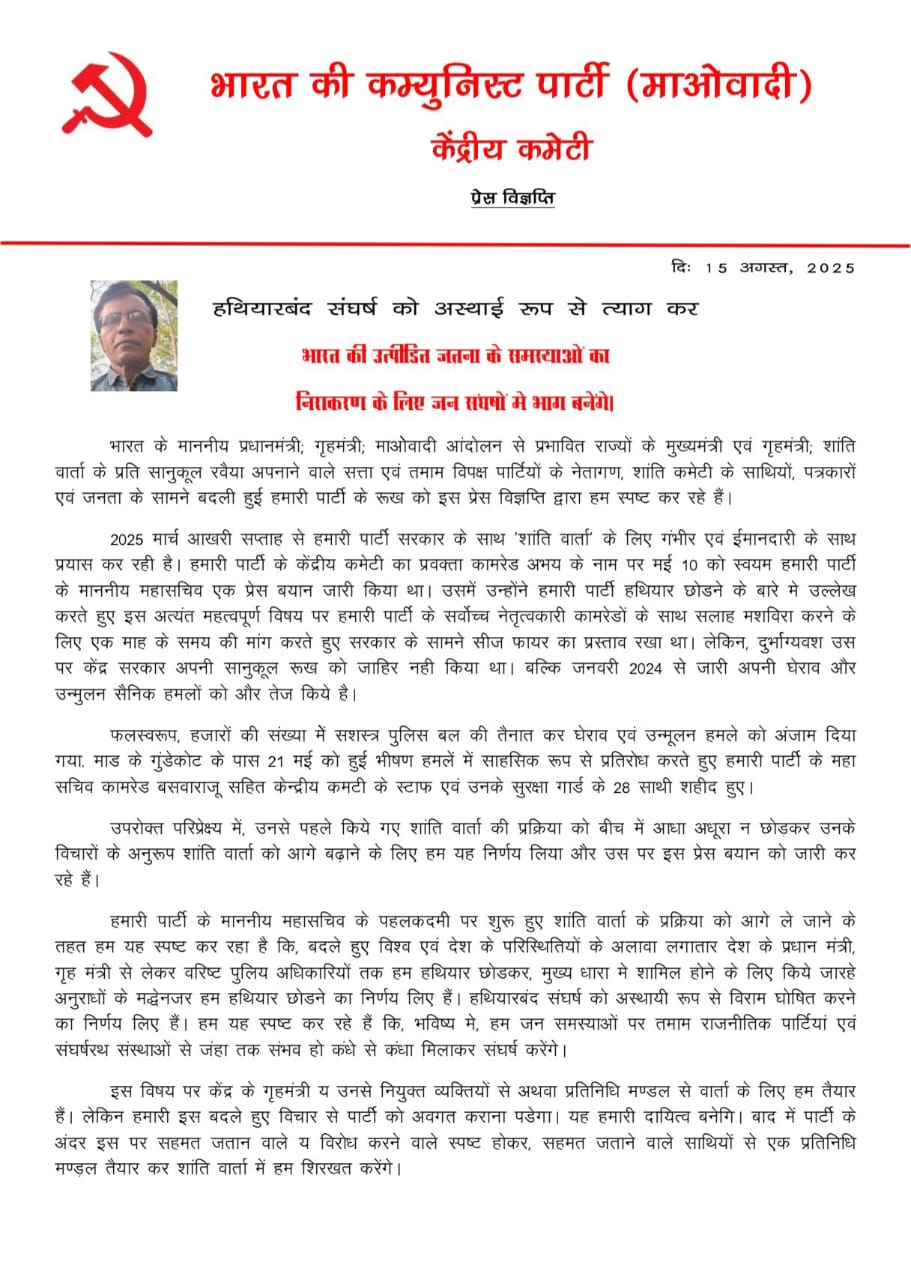 जगदलपुर (डेस्क) – बस्तर में 04 दशक से काबिज माओवादियों ने एक बड़ा कदम उठाते हुए सशस्त्र संघर्ष को अस्थायी रूप से रोकने और शांति वार्ता के लिए सरकार से संपर्क करने का फैसला किया है. बीते 15 अगस्त, 2025 को जारी एक प्रेस विज्ञप्ति में, सीपीआई (माओवादी) की केंद्रीय कमेटी के प्रवक्ता अभय ने कहा कि पार्टी ने हथियार छोड़कर मुख्यधारा में शामिल होने का निर्णय लिया है. यह प्रेस नोट मीडिया तक माओवादियों ने मेमोरी कार्ड( चिप) के जरिये भेजा था. माओवादियों में यह प्रेस नोट पहली दफा खुद की फ़ोटो डालकर जारी की है.