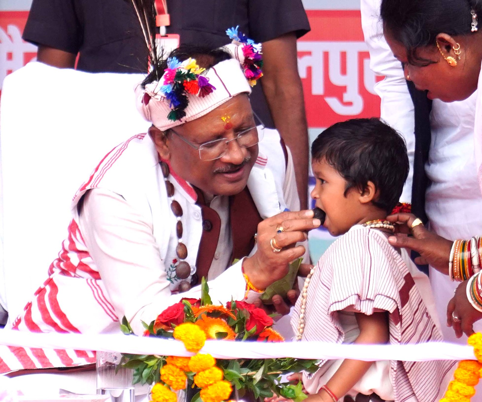 जगदलपुर (डेस्क) – बस्तर की संस्कृति और सादगी का मनमोहक दृश्य तब साकार हो उठा, जब छत्तीसगढ़ के मुख्यमंत्री विष्णुदेव साय ने धुरवा समाज के नुआखाई मिलन समारोह में एक नन्ही बच्ची को दुलार से अपनी गोद में बिठाया और अपने हाथों से महुआ लड्डू खिलाया. यह पल इतना आत्मीय था कि इसने पूरे समारोह को प्रेम और वात्सल्य से भर दिया.